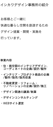 ¡Ž– ‹Æ ŠT —v E–¼Ì@@@@@ƒCƒVƒJƒƒfƒUƒCƒ“Ž––±Š EŠÝ’n@@@@ §222-0021@_“Þ쌧‰¡•lŽs`–k‹æŽÂŒ´–k1-1-15”103 EÝ—§”N“x@@@2000”N8ŒŽ1“ú E‘ã•\@@@@@Îì ® @@@All About ƒtƒ@ƒjƒ`ƒƒ[•ÒW’· E‰Á–¿’c‘Ì@@@Œö‰vŽÐ’c–@l“ú–{ƒCƒ“ƒeƒŠƒAƒfƒUƒCƒi[‹¦‰ï —Ž–